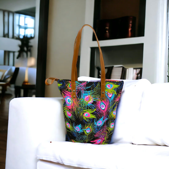 The best way to add some sunshine to your day is to fling this tote over your shoulder. The vibrant colours will put a spring in your step in no time. Made from a canvas-type material and screen printed in the most gorgeous bold colours. She's a great size for taking to the shops when you're buying a few bits and pieces or to the beach when all you need is a book, a sarong and something cold to drink. She easily fits a laptop in her if you plan on making a statement at work! Inside she's lined and there's a small pocket with a zip that's big enough for an iPhone to fit in. 35cm high and 34 cm wide Made in Thailand