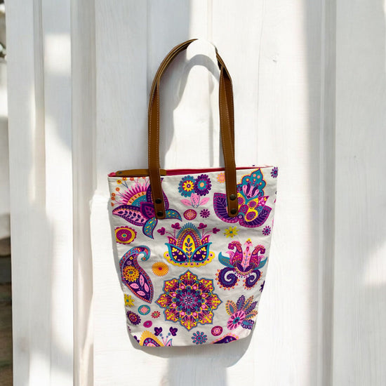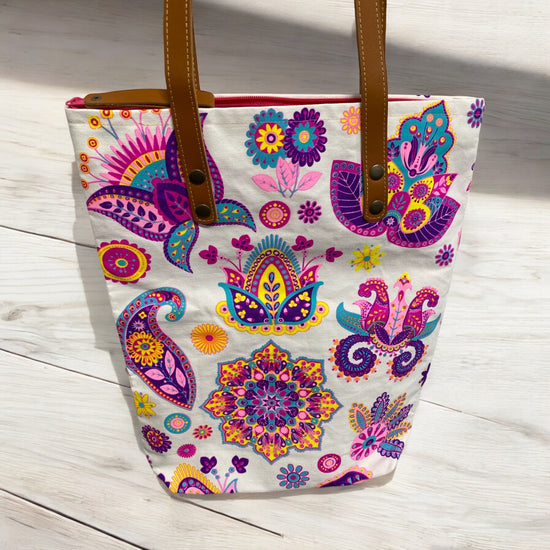 The best way to add some sunshine to your day is to fling this tote over your shoulder. The vibrant colours will put a spring in your step in no time. Made from a canvas-type material and screen printed in the most gorgeous bold colours. She's a great size for taking to the shops when you're buying a few bits and pieces or to the beach when all you need is a book, a sarong and something cold to drink. She easily fits a laptop in her if you plan on making a statement at work! Inside she's lined and there's a small pocket with a zip that's big enough for an iPhone to fit in. 35cm high and 34 cm wide Made in Thailand