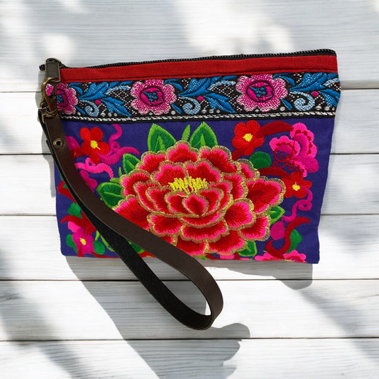 This style has a handy little detachable leather hand loop. Machine embroidered fabric with a zip to close. 21cm long x 13cm wide Made in Thailand.
